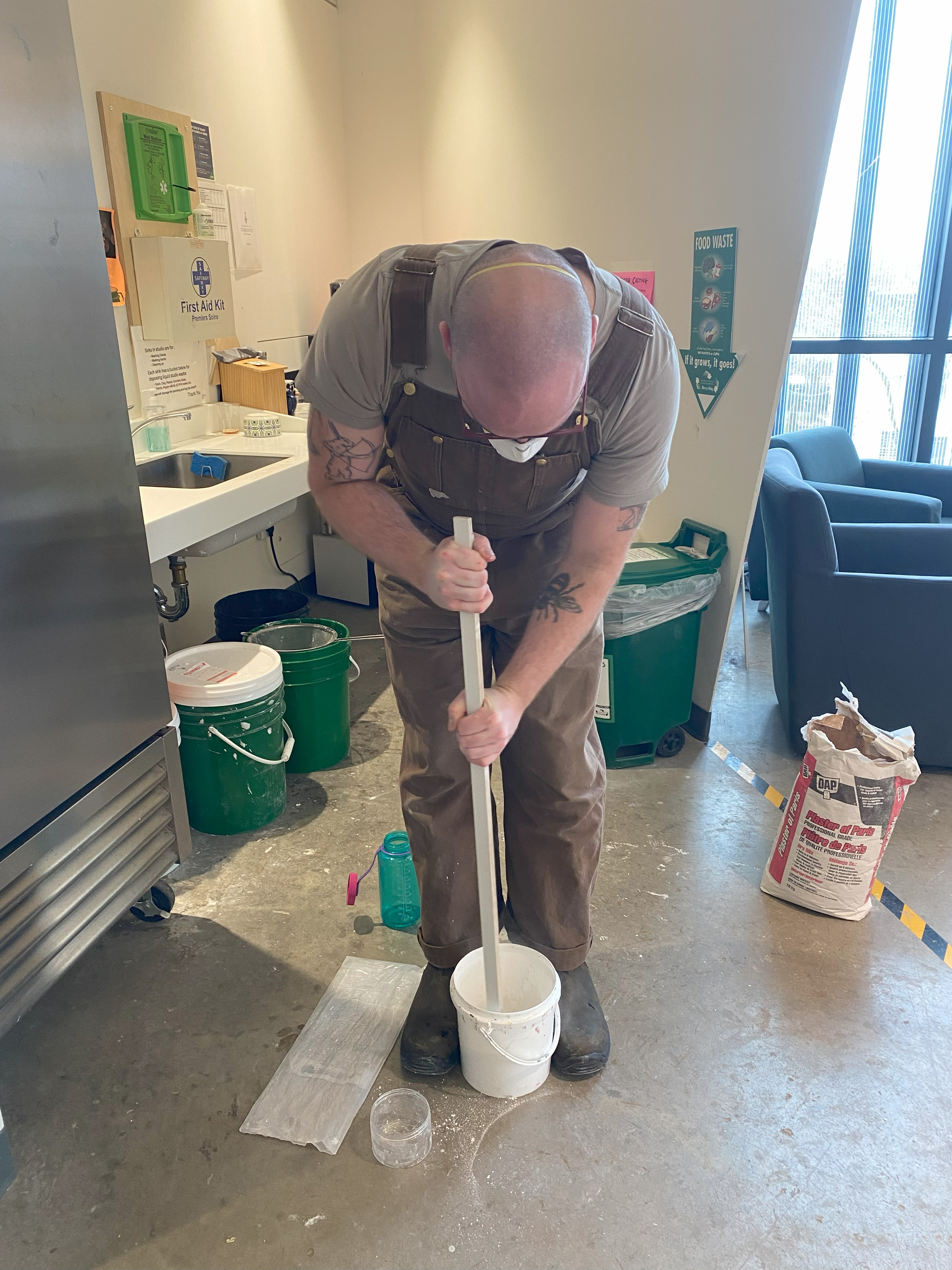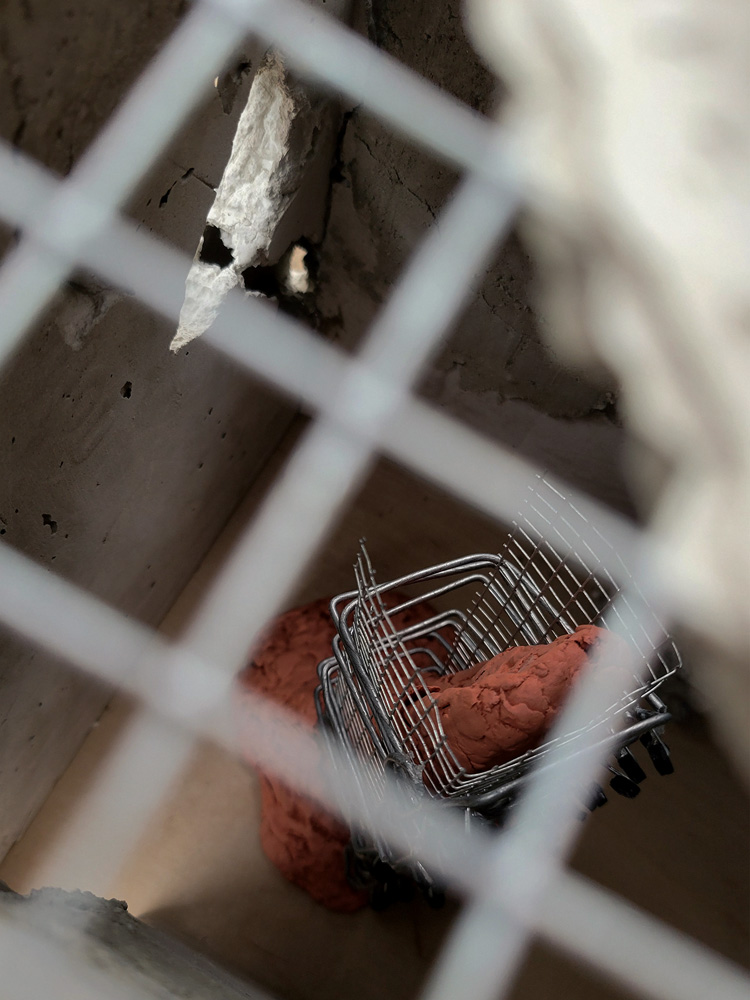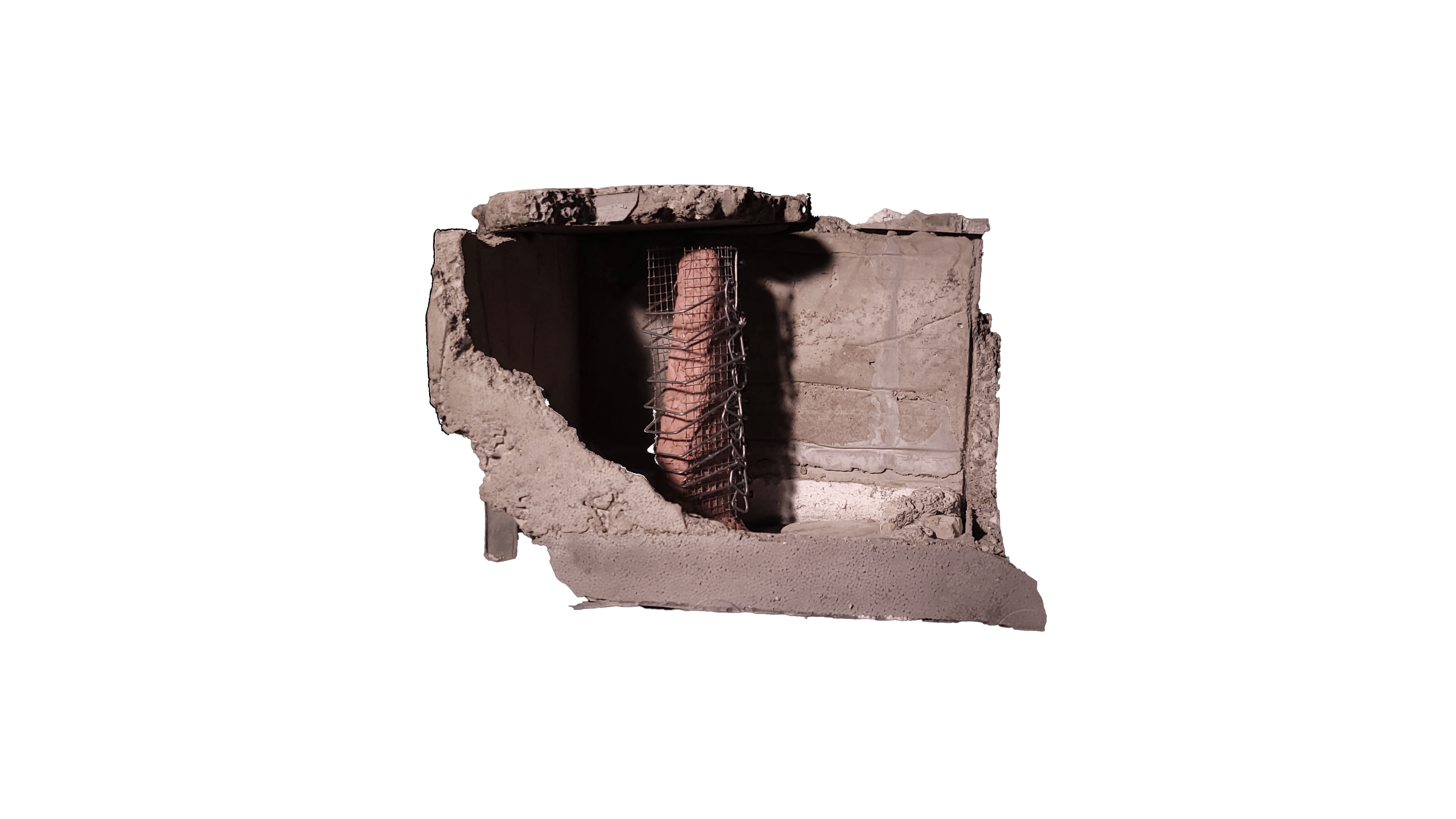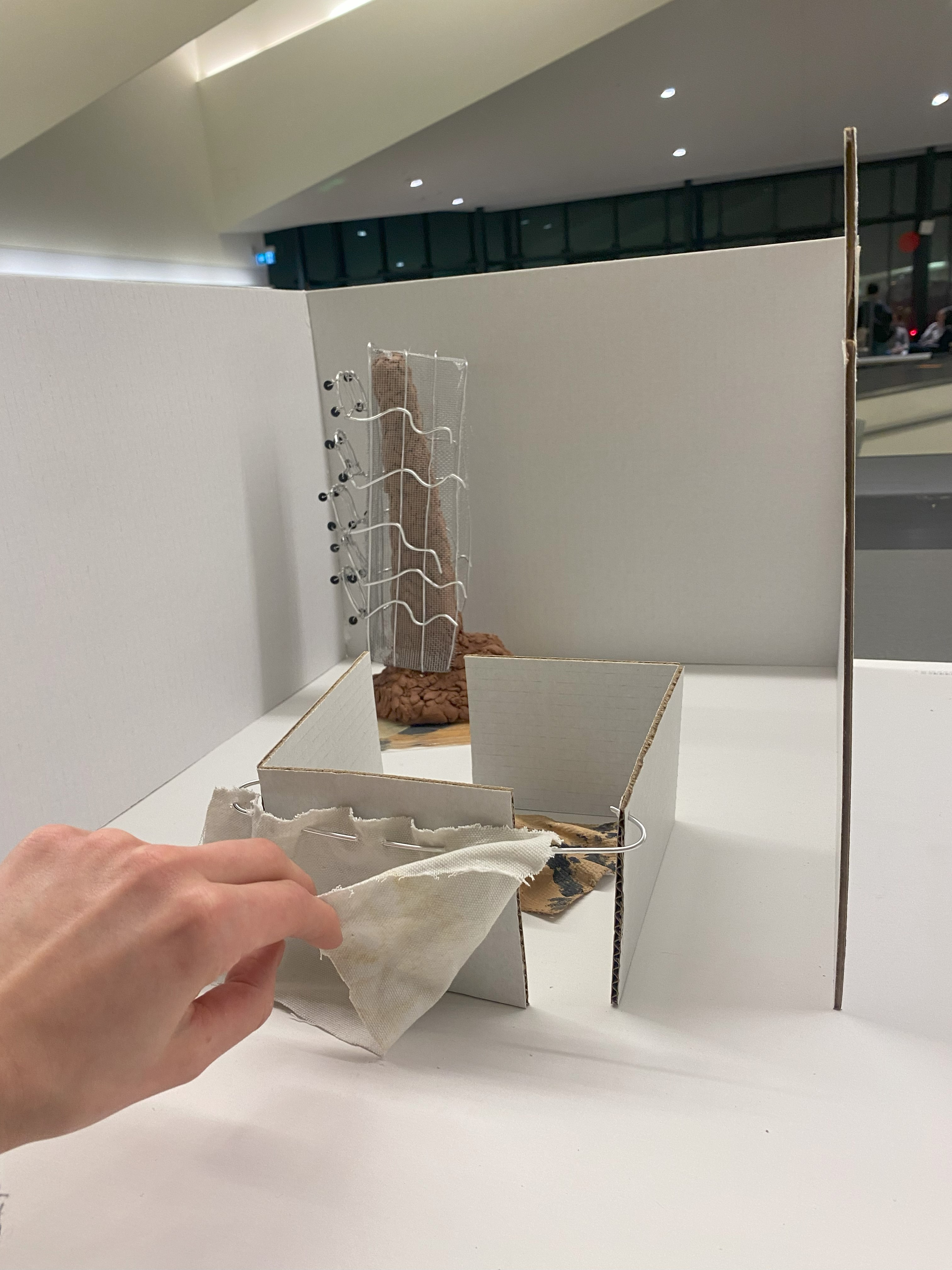 When thinking through a space to house Rebecca Belmore’s sculptures, Tower, tarpaulin, it was essential to us that the environment we create treats the artwork’s subject (the houseless crisis in Vancouver) with the attention and sensitivity it deserves. We felt this artwork was best suited for a commanding space – a room void of unnecessarily austere architectural elements, and which amplifies the message behind the art. We reflected upon our initial reactions to this piece – discomfort, decay, the reminder of our own precarity, and sought to emulate those feelings through a built form. The journey through this space is processional, taking the visitor through an emotive experience of highs and lows, discomfort and ease, disparity and hope. We reject the term museum or gallery and offer a space oriented towards knowledge-sharing and community. But first, visitors must conront the ‘decay,’ they can’t look past the crisis underscored by Tower, tarpaulin, the main reason for gathering in this space. The artworks are placed in decaying concrete rooms which reference the modern settler city built on concrete condos and extortionate rent prices. Although two pronounced blocks, the concrete is in its deteriorating form and speaks to the precarity of houselessness. The rooms were designed as an individual, insular experience guided by narrow passageways which force the viewer to confront the sculptures one by one. The atmosphere is intentionally uncomfortable and intensified further by the decaying apertures which filter light into the space.